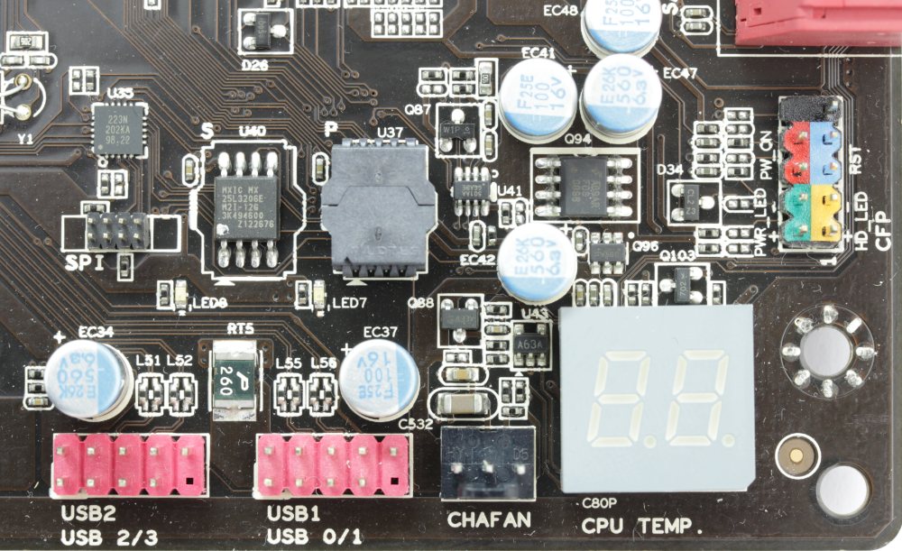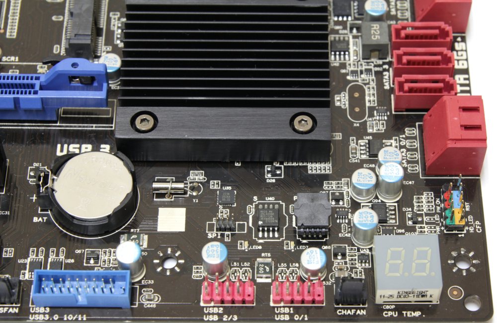 По соседству с ним расположен сдвоенный семисегментный индикатор для отображения POST-кодов загрузки и инициализации системы. Рядом по нижнему краю заметен красный пластик двух колодок для обеспечения четырех устройств USB 2.0. Еще четыре разъема этого стандарта находятся на задней панели. Помимо них там можно обнаружить два порта USB 3.0, а неподалеку еще одну колодку для поддержки еще парочки устройств этого современного интерфейса. Причем в комплекте поставляется специальная панель в отсек 3.5" с двумя такими разъемами. Все это богатство реализовано собственными силами чипсета.