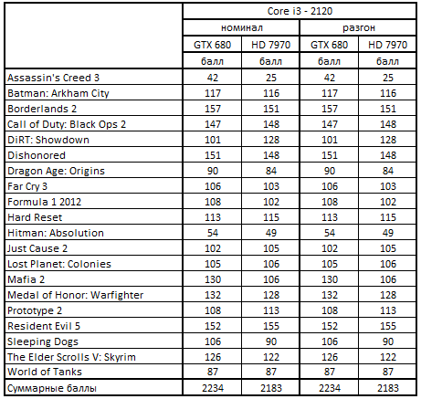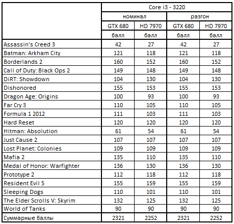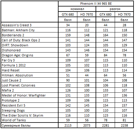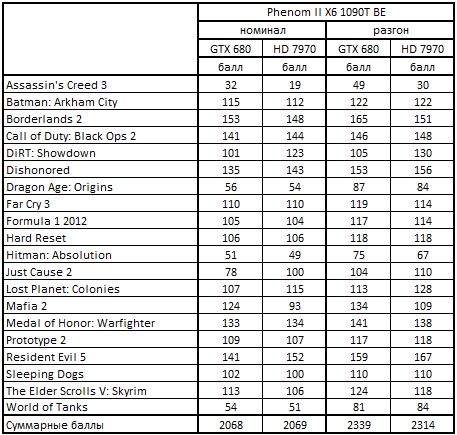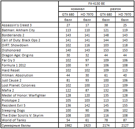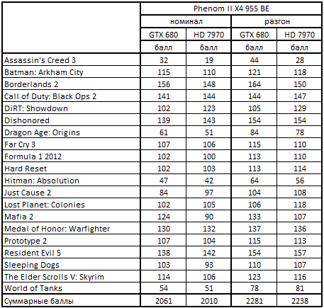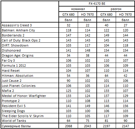Таблица расчета баллов на основе среднегеометрической производительности систем в двадцати играх (средний FPS)