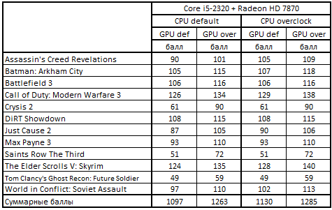 Сводная таблица производительности Core i5-2550К + Radeon HD 7870 и Core i5-2320 + Radeon HD 7870, где за 100% взят результат Core i5-2320 + Radeon HD 7870