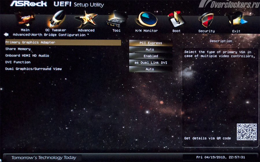 Во вкладке настроек северного моста почему-то нашлось место только для опций, касающихся видеосистемы. Здесь можно выбрать приоритетный тип адаптера (встроенное ядро или карта, установленная в слот PCI-e), определить объем выделяемой памяти и выставить некоторые дополнительные настройки (вывод звука через порт HDMI, режим работы порта DVI).