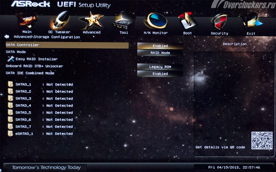 Вкладка Storage Configuration позволяет задать режим работы SATA-контроллера, также здесь отображаются все подключенные к системе диски (в моем случае на момент съемки таковых не было). Помимо прочего в этой вкладке размещен удобный инструмент для организации RAID-массива – Easy RAID Installer. Воспользовавшись им, можно распределить роли дисков в массиве, а также задать объем страйпа.