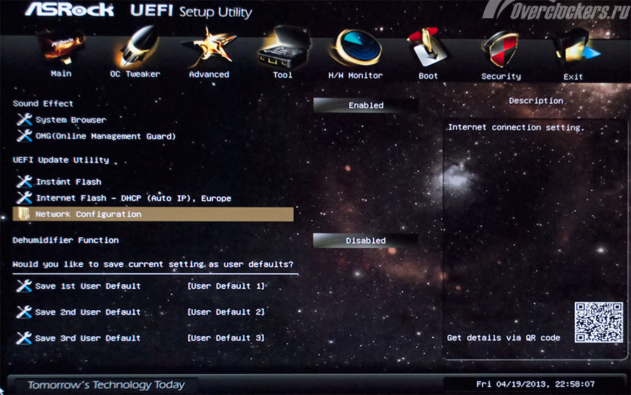Во-первых, это два инструмента прошивки BIOS – Instant Flash (с помощью флэш-накопителя) и Internet Flash (через сеть, причем можно выбрать один из многочисленных серверов ASRock). Во-вторых, уже знакомая читателям по ранее протестированным платам ASRock утилита System Browser. При ее активации на экране отображается фотография материнской платы с несколькими подсвеченными областями: процессор, память, разъемы SATA, разъемы задней панели. Наводя курсор на каждую из них, можно получить информацию о типе подключения и режиме работы данного «модуля» (для процессора, к примеру, будет отображаться тип и частота).