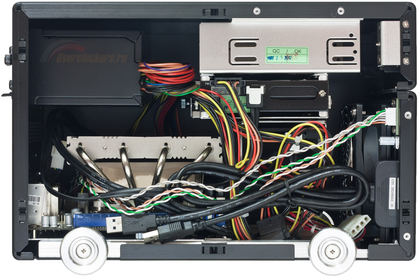 Смущает лишь расположение корзины для 3.5 дюймового накопителя, которая зачем-то оказалась вынесена в верхнюю часть и, скорее всего, практически лишилась обдува. Но факт остается фактом, инженерам компании удалось скомпоновать элементы весьма грамотно, максимально задействовав свободное пространство.