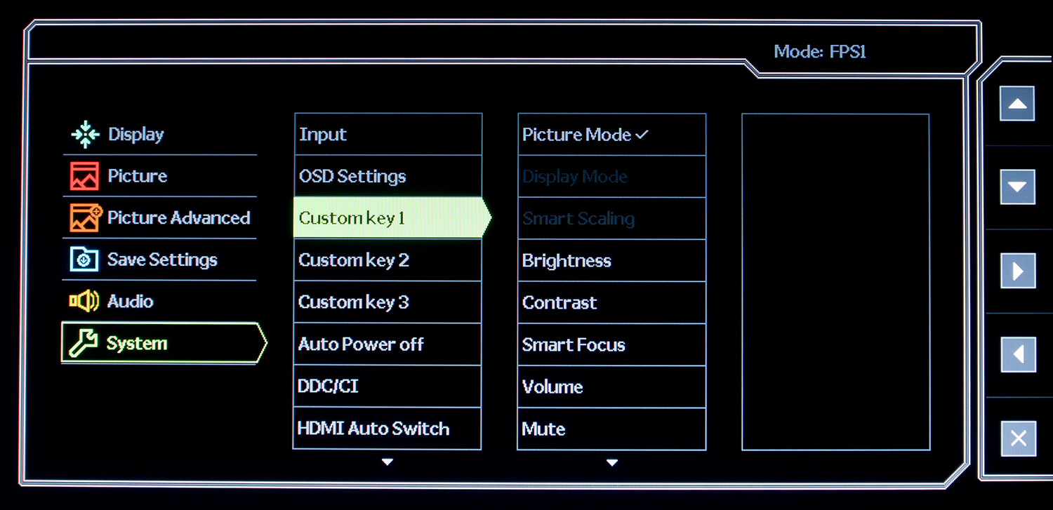 Изначально при нажатии на любую из клавиш появляется полоса с быстрым доступом к некоторым функциям и входом в основное меню. По умолчанию на две из них назначены разделы с выбором предустановленных режимов изображения и работы встроенного и продвинутого скалера. Третья клавиша (с лупой) осталась неопределенной – никаких действий при ее нажатии не происходило. Четвертая кнопка вызывает основное меню, а пятая скрывает панель быстрого доступа. В случае необходимости три сенсорных клавиши можно переназначить на другие действия.