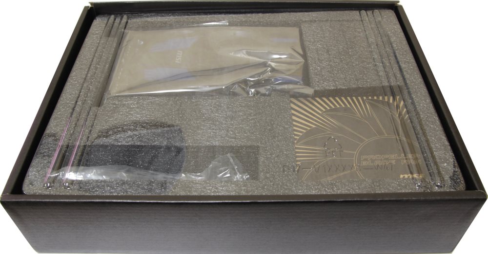В ней расположен каркас из вспененного полиэтилена, в котором сделано несколько отсеков. В одном из них скрывается сама видеокарта в антистатическом пакете. В другом – коробка с дополнительным вентилятором. В третьем – аксессуары. После извлечения каркаса появляется доступ к картонной крышке, которая образует второе дно. В свободном пространстве этого отсека спрятаны диск и инструкции.