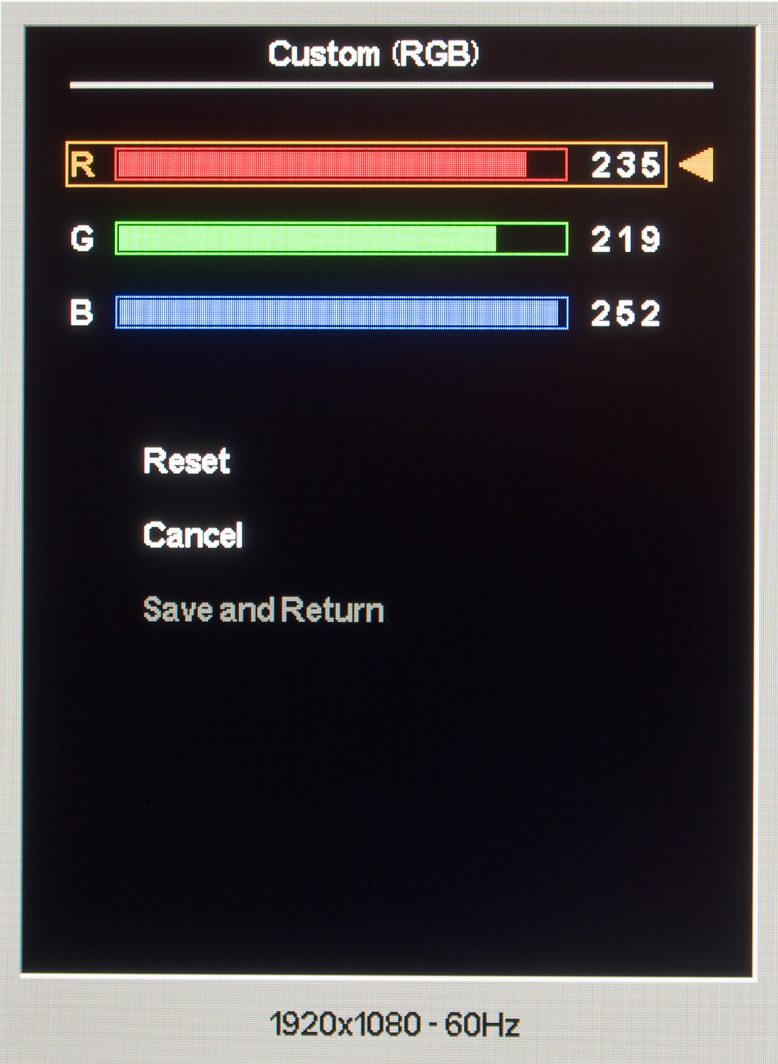 У рассматриваемого монитора нет специальных предустановленных пресетов изображения, а заводские настройки выглядят следующим образом:
