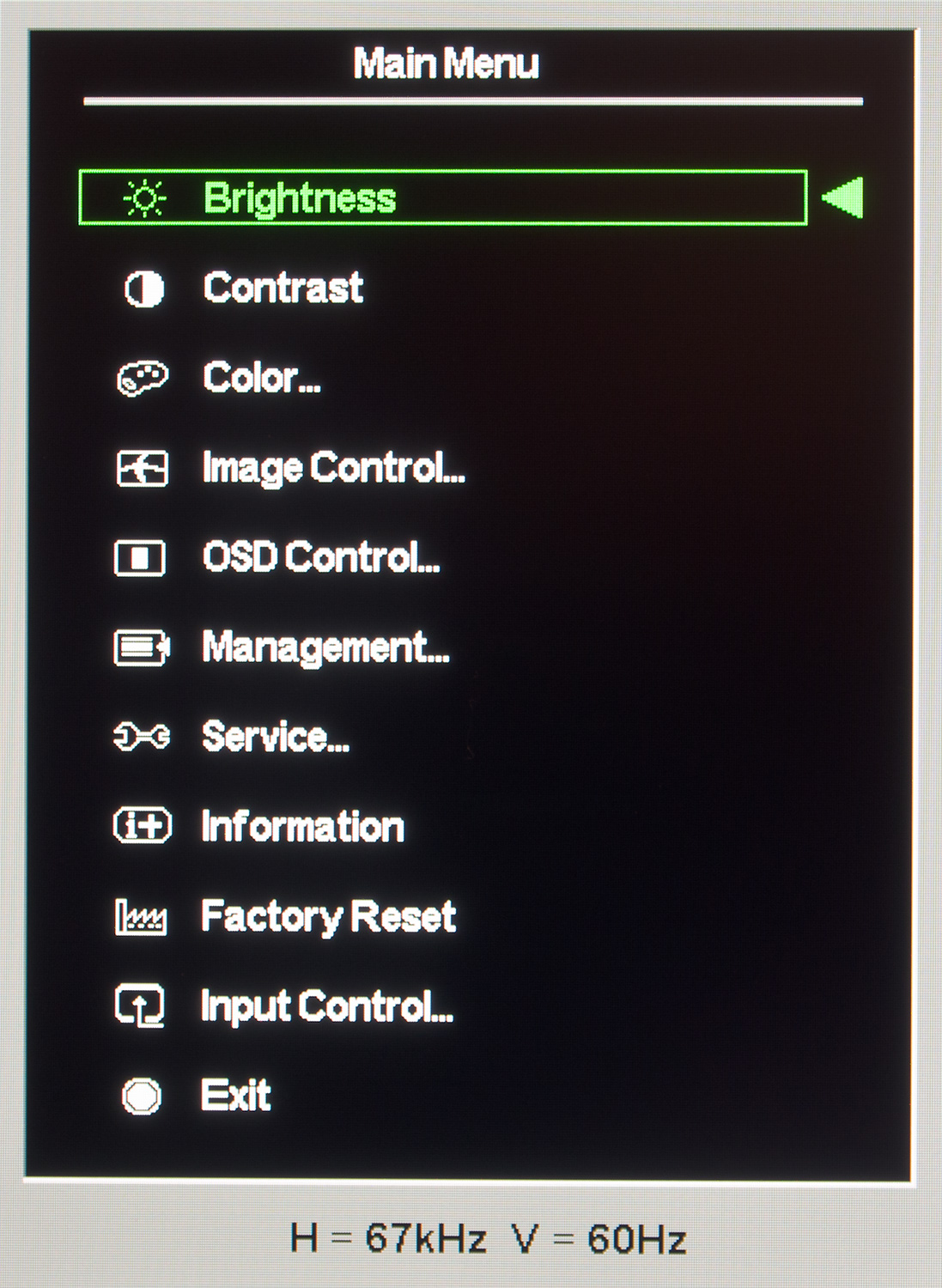 Доступ к сервисному меню был найден за счет зажатия клавиши Menu во время включения монитора. В дальнейшем необходимо нажать ее повторно и перед вами предстанет уже знакомое окно, но на этот раз с выделением разделов зеленым цветом и новой вкладкой Service.