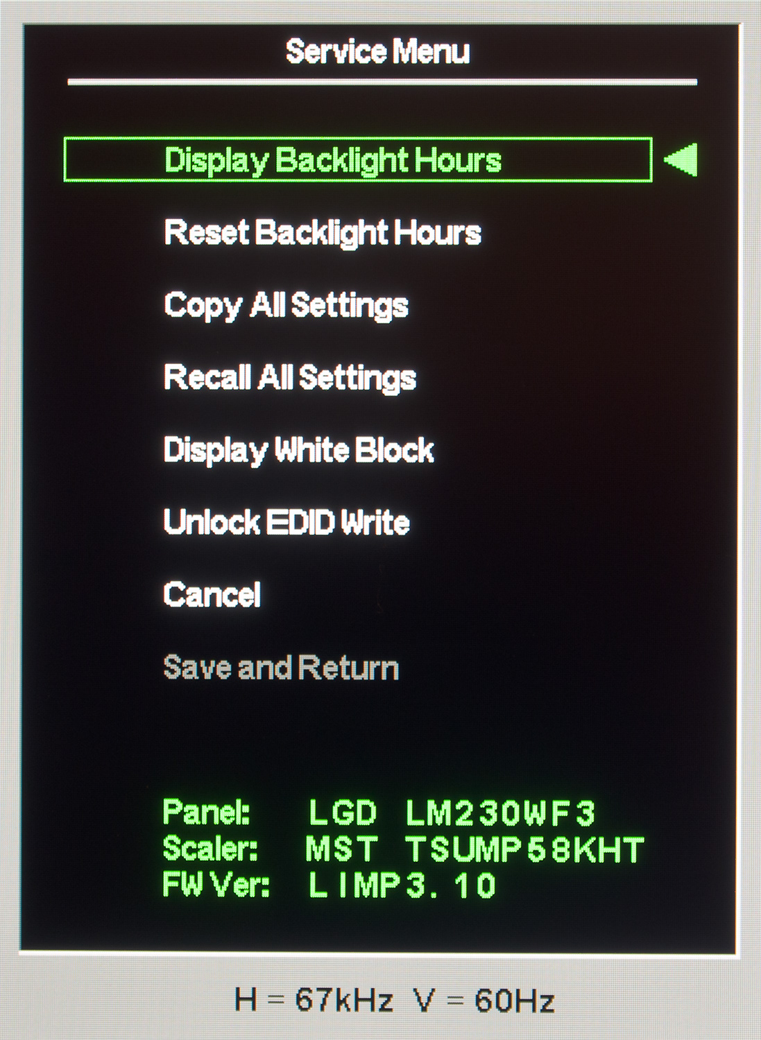 Заходим в нее и видим указание используемой матрицы, скалера и версии прошивки. Некоторым может понадобиться возможность сброса значения Backlight Hours, разблокировки EDID’а, сброса всех настроек или их установки по умолчанию (те, которые вы выставили в основном меню). Фактически же ничего особо полезного найденный доступ к сервисным настройкам не предлагает.