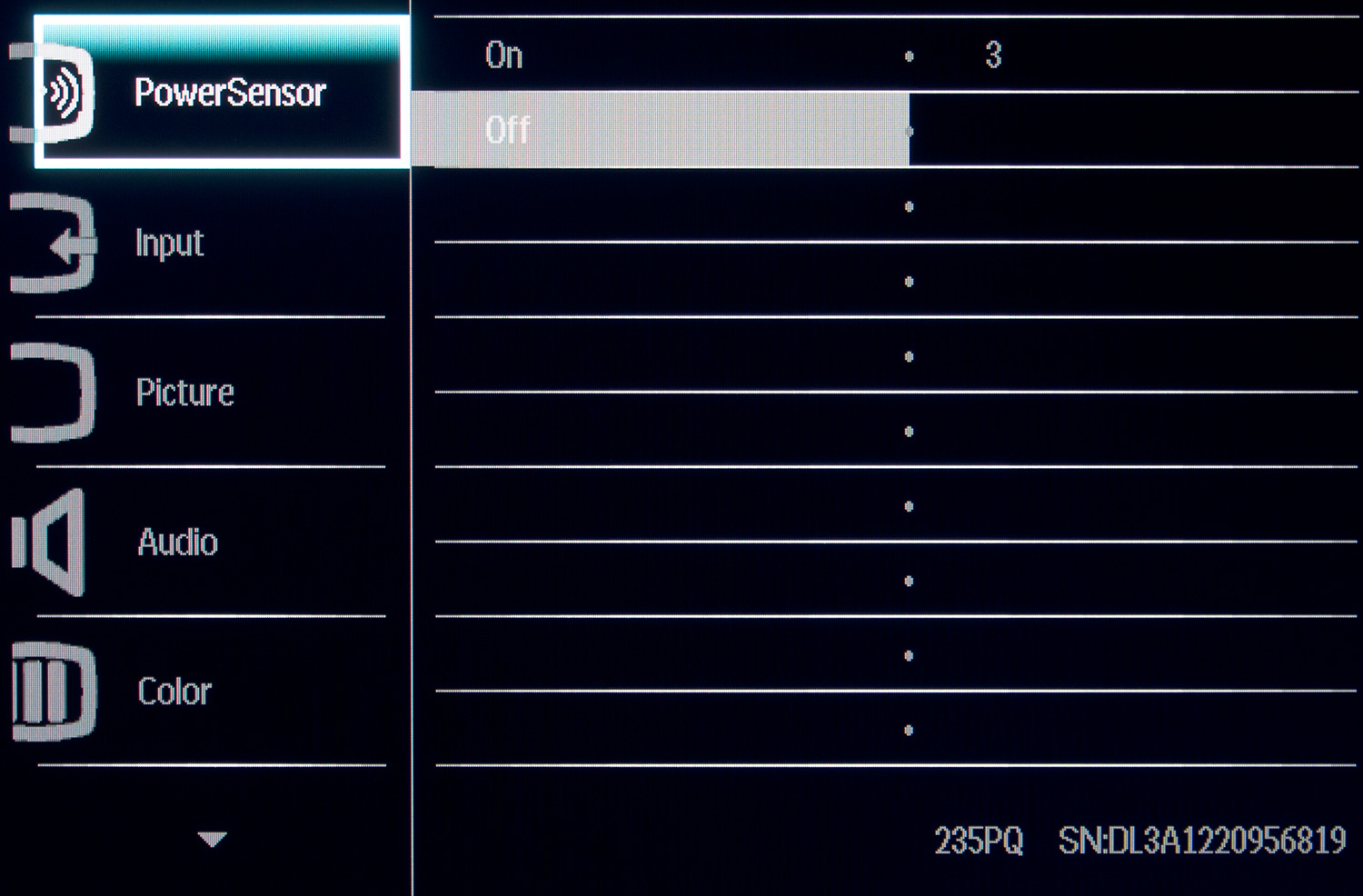У Philips 235PQ2EB присутствует датчик приближенности (технология PowerSensor – без пробела между словами). Изначально он активирован со значением 3, а в ходе настройки его можно изменить в пределах от 1 до 4 (цифра означает чувствительность сенсора). Чем она выше, тем при меньшем расстоянии человека до монитора срабатывает используемая технология. Делает она это без большой задержки.