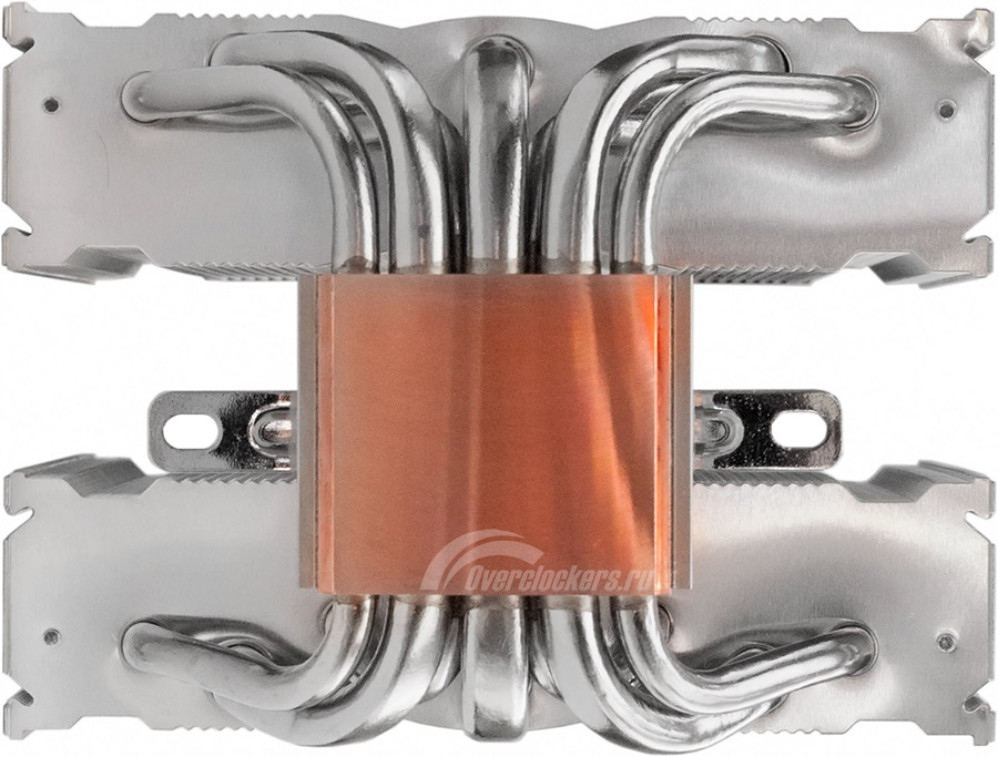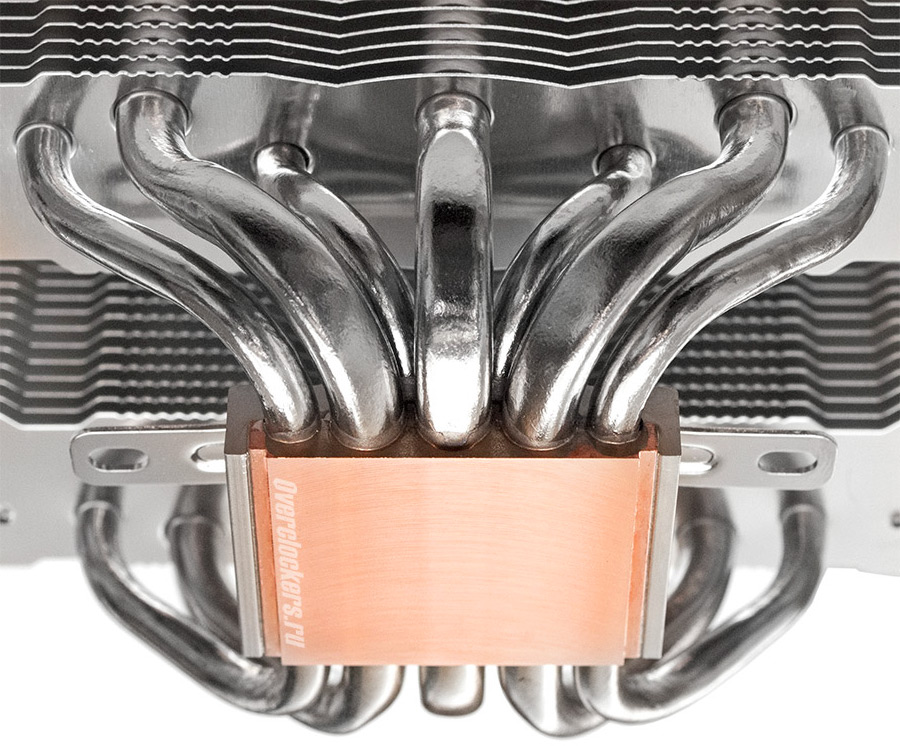 Стоит отметить, что основание выделяется не только необычностью схемы, но и аккуратностью изготовления: трубки уложены в специальные желобки, все детали соединены между собой с помощью пайки. А вот в местах контакта ТТ с ребрами радиатора следов припоя найти не удалось, скорее всего, здесь используется самая простая технология «напрессовки».