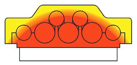 В массиве радиатора трубки размещены в шахматном порядке, что должно обеспечить более равномерный прогрев ребер по всей площади.