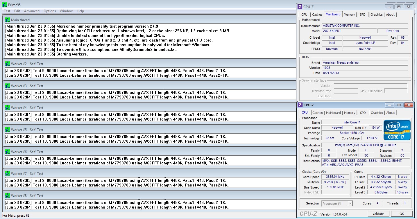 Разгон процессоров Intel Haswell целиком и полностью ограничивается температурным режимом, ибо между крышкой и ядром используется термопаста вместо припоя. Стендовый экземпляр процессора позволил пройти тест стабильности без троттлинга лишь при напряжении питания 1.185 В (установленное в UEFI значение).