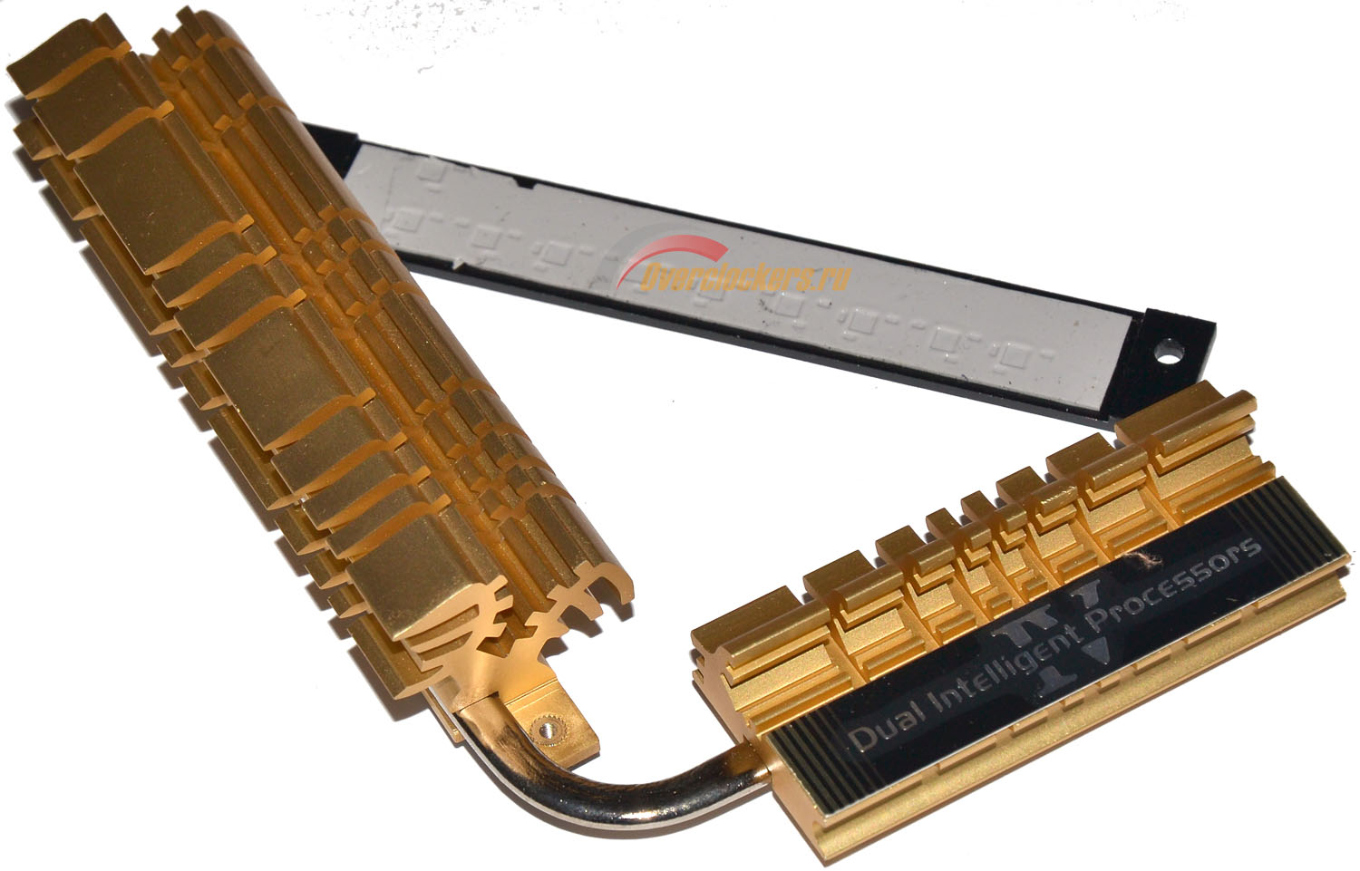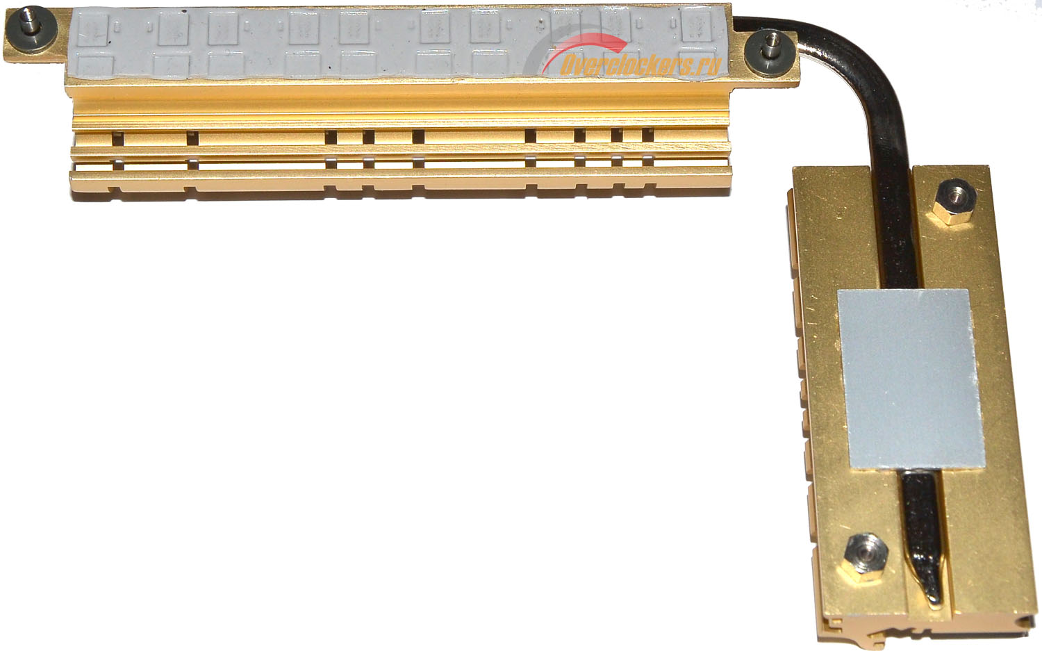 Основную функцию по отводу тепла от преобразователя питания процессора (транзисторы десяти фаз питания из шестнадцати) выполняет связка из двух радиаторов, объединенных теплотрубкой: