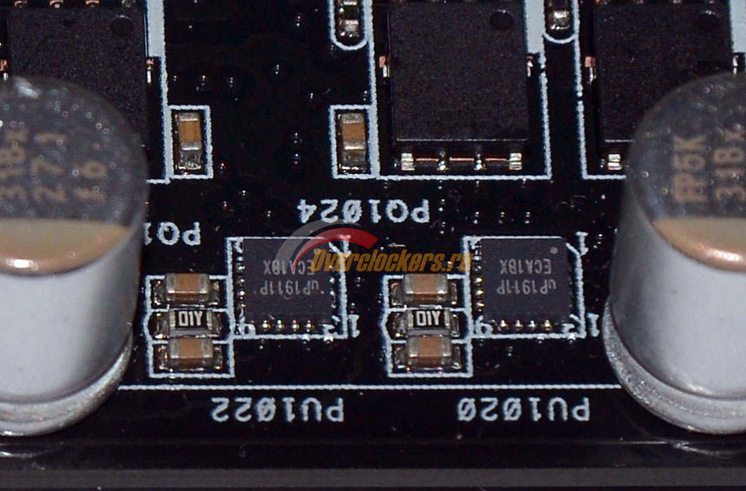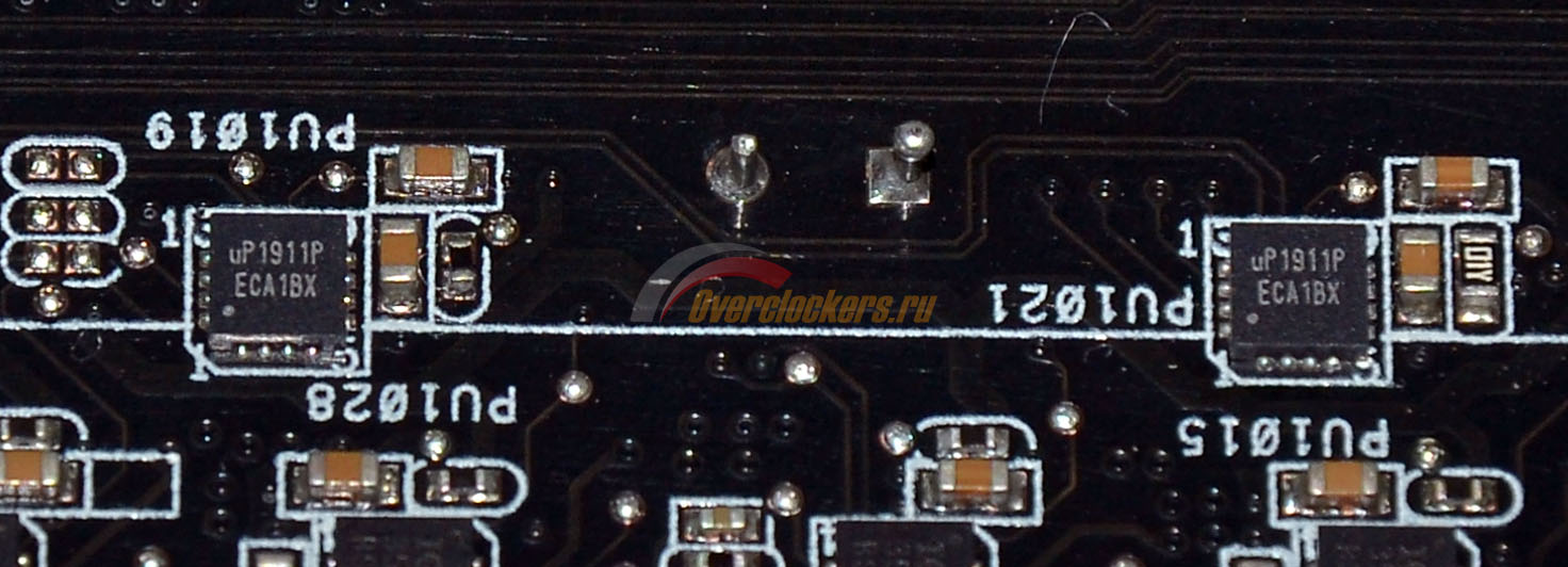 Помимо этого в преобразователе питания процессора можно встретить четыре микросхемы с маркировкой uP1911P, они, видимо расширяют возможности PWM контроллера для работы с шестнадцатью фазами:
