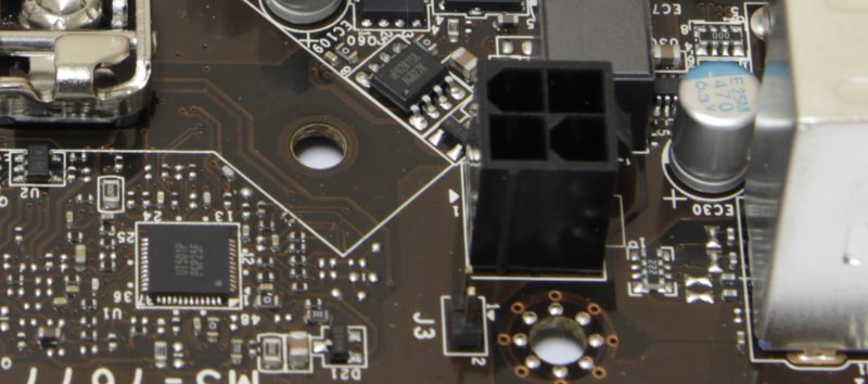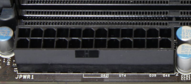 Поэтому здесь точно такие же черные разъемы и коричневая печатная плата. Схожим образом подается питание. Для этих целей используются один основной 24-х контактный разъем и дополнительный 4-х. Как и в предыдущем случае, без последнего плата отказывается запускаться, а по формуле 20+4 работать может.