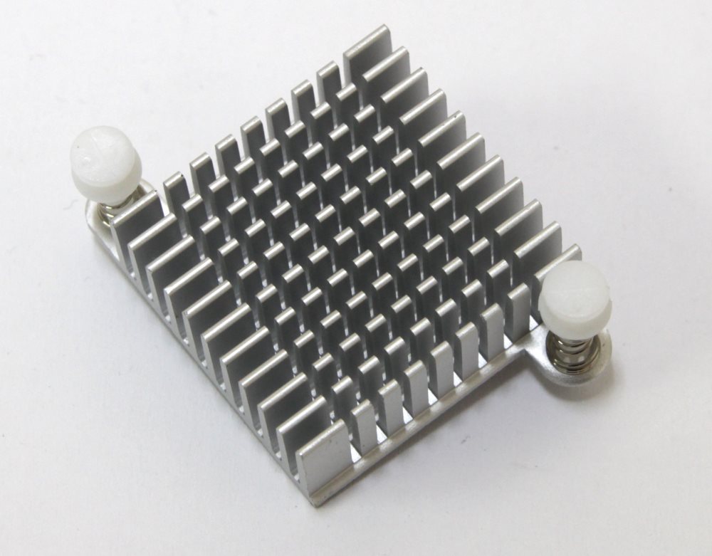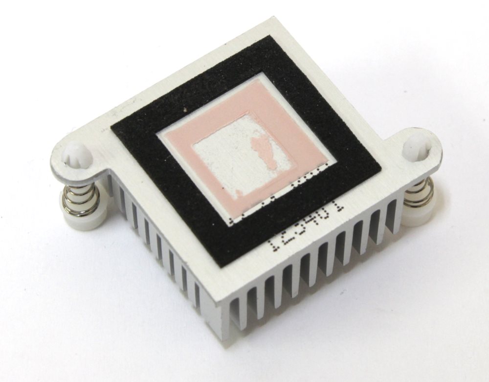 Он изготовлен из алюминиевого сплава и крепится при помощи двух пластиковых клипс на пружинках. На удивление его ребра хорошо развиты, они достаточно высокие и их много, поэтому общая площадь отвода тепла получается не такая уж маленькая. В качестве термоинтерфейса применена все та же розовая «терможвачка». По периметру места контакта есть защитная рамка из черного мягкого пористого материала, которая должна защищать от перекосов.