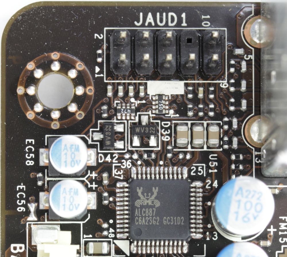 В левом нижнем углу расположился звуковой кодек Realtek ALC887. Рядом с ним есть разъем для подключения передней аудиопанели.