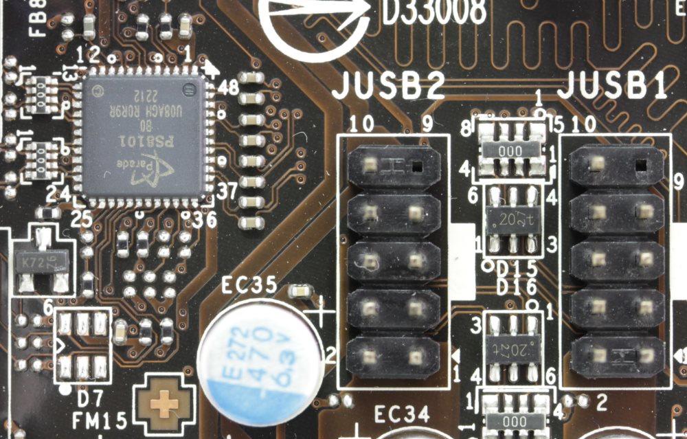 Над слотом PCI-e x1 находится колодка для подключения кнопок и индикаторов корпуса, а также две USB 2.0 для обеспечения четырех устройств.