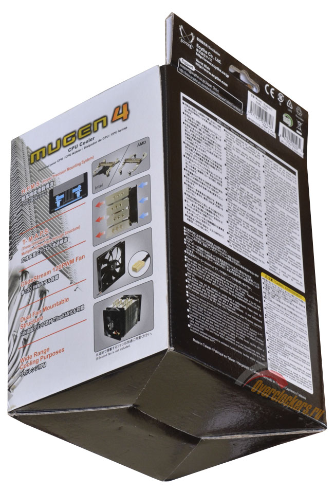Сзади выведено большое извещение на нескольких языках о гарантийной политике компании. Русскоязычное население осталось обделенным, так что на кириллице здесь только место «рождения» кулера, коим является остров Тайвань.