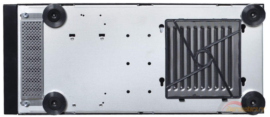 Блок питания располагается снизу. Он ставится на специальный постамент из двух алюминиевых рельсов, на которые в свою очередь приклеена пара резиновых прокладок. Закрепить PSU можно в двух положениях. Для вентиляции в днище сделано несколько прорезей.