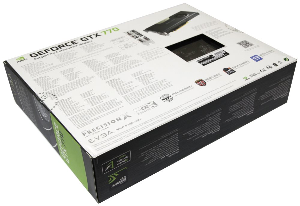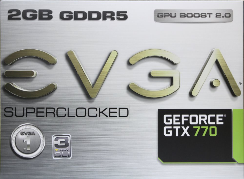 Начнем наше знакомство с EVGA GTX 770 SC. Приставка на конце означает Superclocked, за ней скрываются заводской разгон и повышенные частоты. Несмотря на это, коробка средних габаритов выполнена в серых невзрачных тонах.
