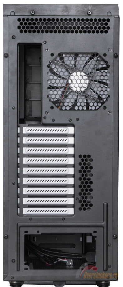 Девять слотов расширения закрыты белыми заглушками. Блок питания располагается снизу. Странно, но задняя стенка лишена уже такого привычного атрибута как вырезы под шланги СВО.