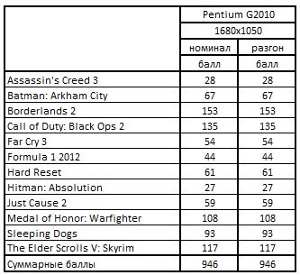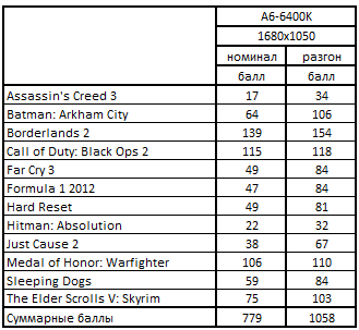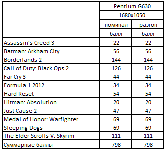 При помощи вышеуказанных формул были рассчитаны баллы для всех конфигураций по отдельно взятым играм. Дальше был выведен итоговый балл, путем расчета среднегеометрической величины по двенадцати играм.