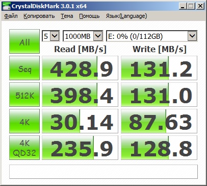 Можно сделать интересное наблюдение: похоже, JMicron начала решать проблему с потерей скоростных характеристик записи на заполненном накопителе (вспомним, например, Silicon Power S50). Заметно, что хотя скоростные характеристики и проседают, здесь ограничителем становится сама флеш-память: всего восемь кристаллов далеко не самой быстрой памяти Micron. Даже наблюдается некоторый рост скоростей линейного чтения и чтения блоками 512 Кбайт.