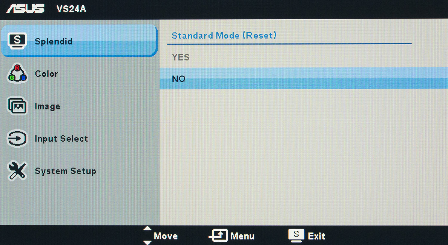 При входе в OSD перед пользователем предстает шесть главных вкладок. В первой перечислены все предустановленные режимы Splendid. Помимо выбора нужного, настройки каждого из них можно скинуть до заводских значений, в том случае если ваши ручные корректировки пришлись некстати.