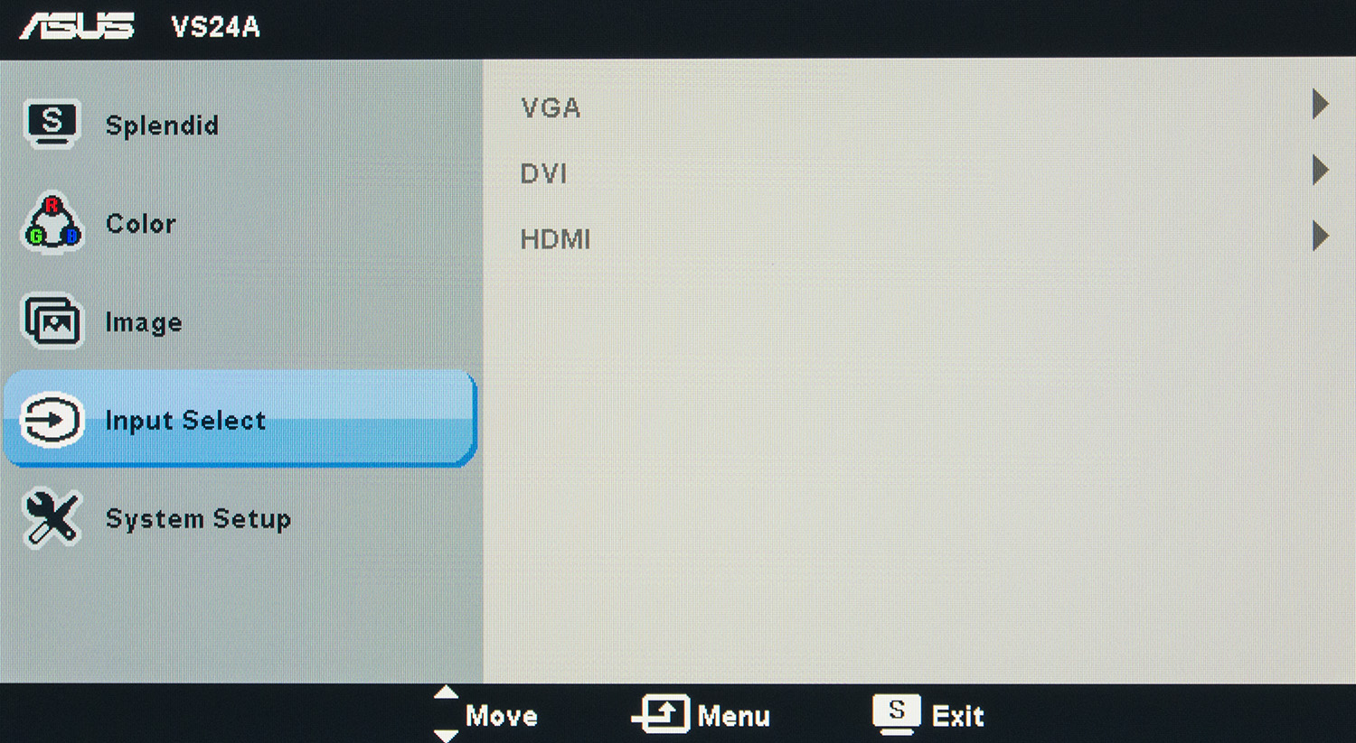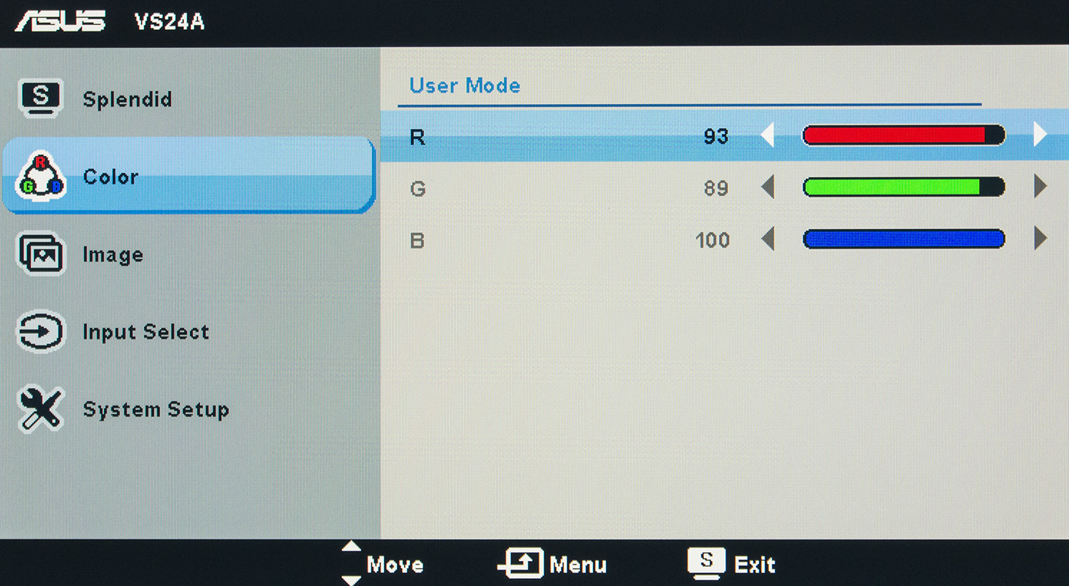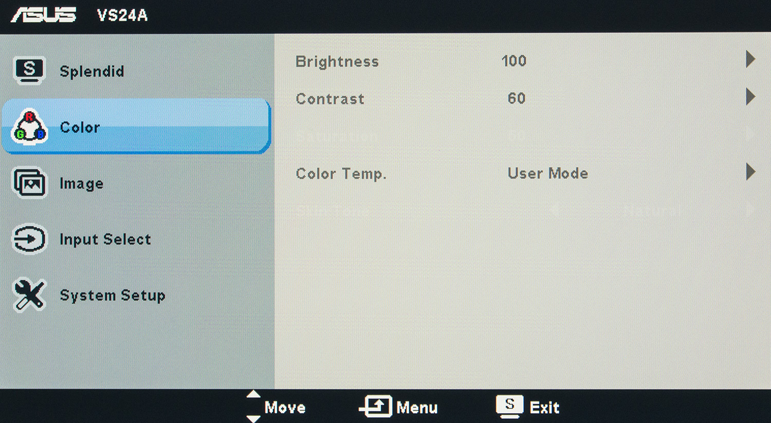 У монитора ASUS VS24AH нет каких-либо датчиков и сенсоров (освещенности, приближения), а в меню среди настроек отсутствуют параметры, которые могли бы дополнительно повлиять на точность цветопередачи.