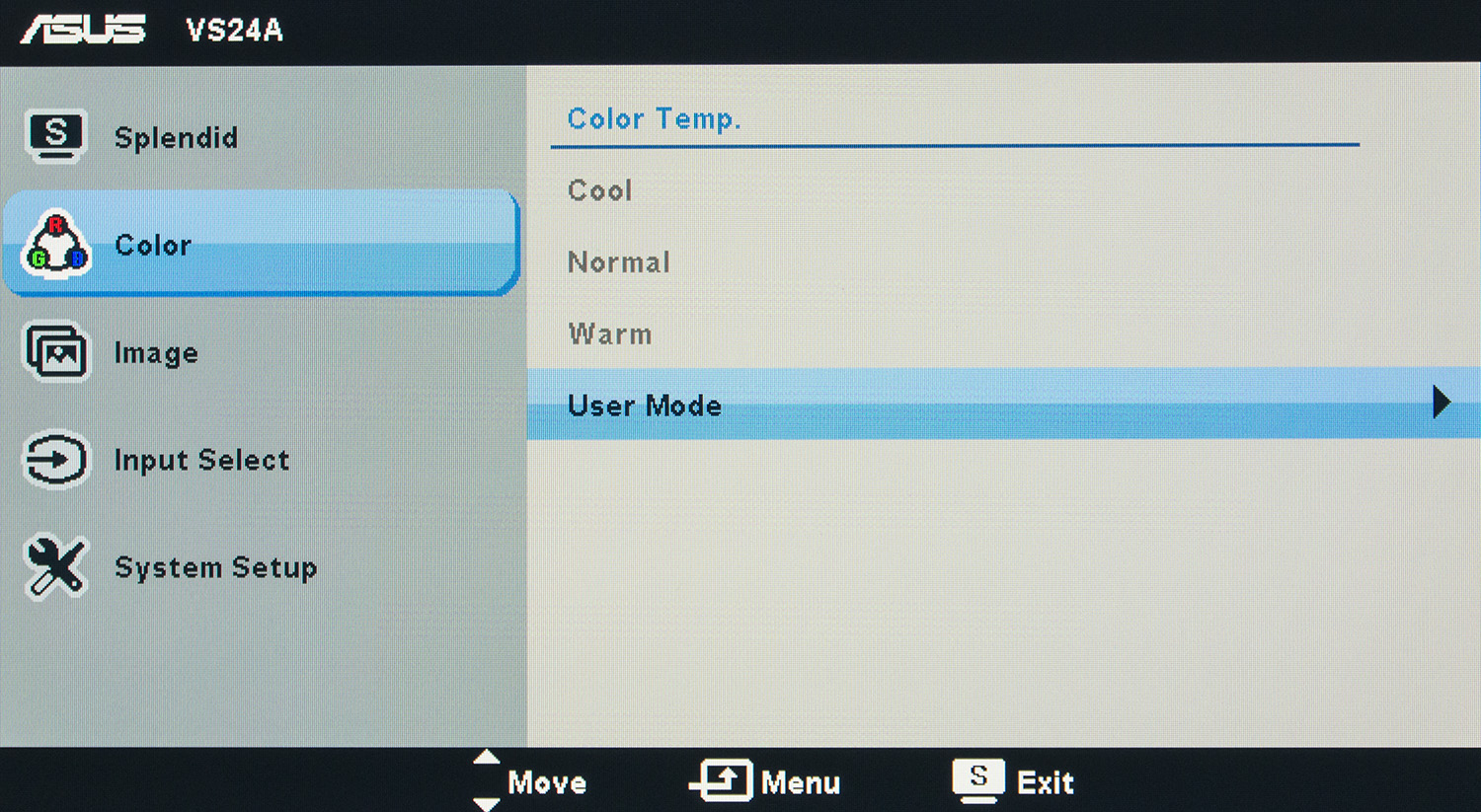 В нем же находятся настройки цветовой температуры. Уже по умолчанию производитель выбрал User, в котором можно отрегулировать RGB значения. Кроме него присутствуют еще три предустановленных пресета Color Temp.