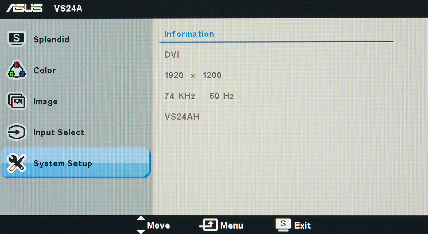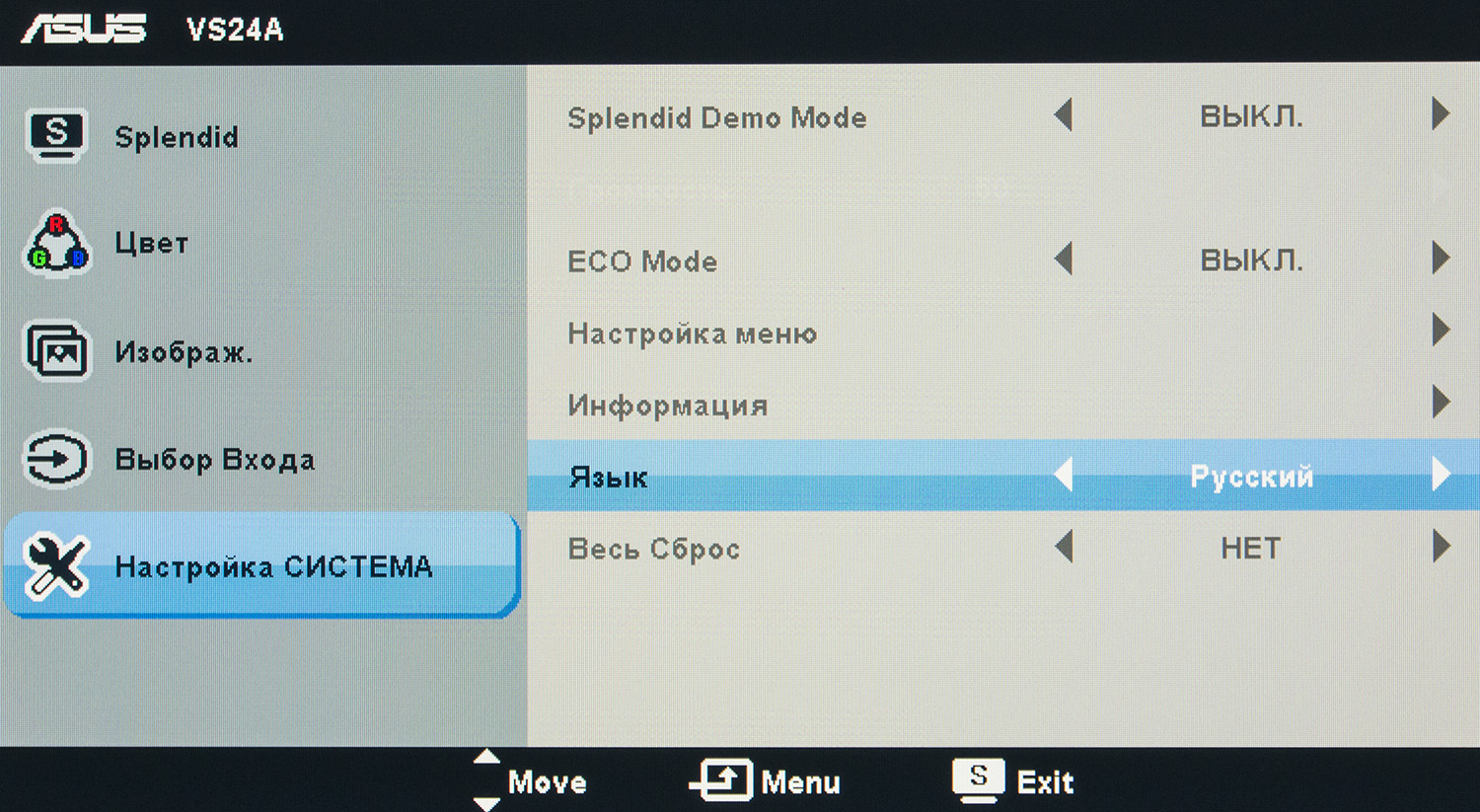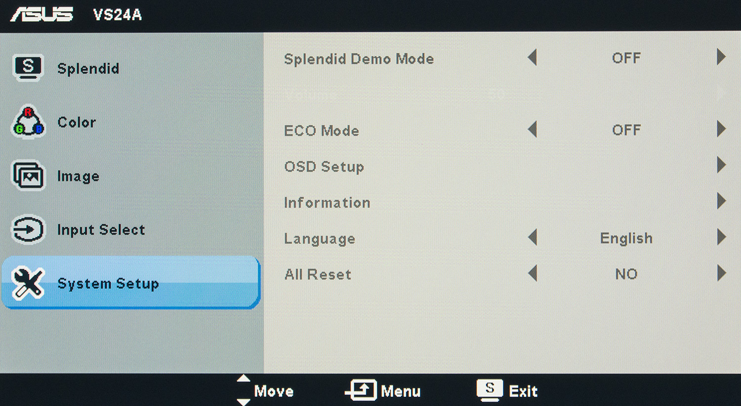 Последний раздел System Setup скрывает не столь полезные настройки. Среди таковых: включение демонстрации работы технологии «улучшения» картинки Splendid, регулировка громкости при подключении наушников или внешних динамиков, активация ECO пресета (яркость падает почти до самой нижней границы) и сброс всех настроек к значениям по умолчанию.