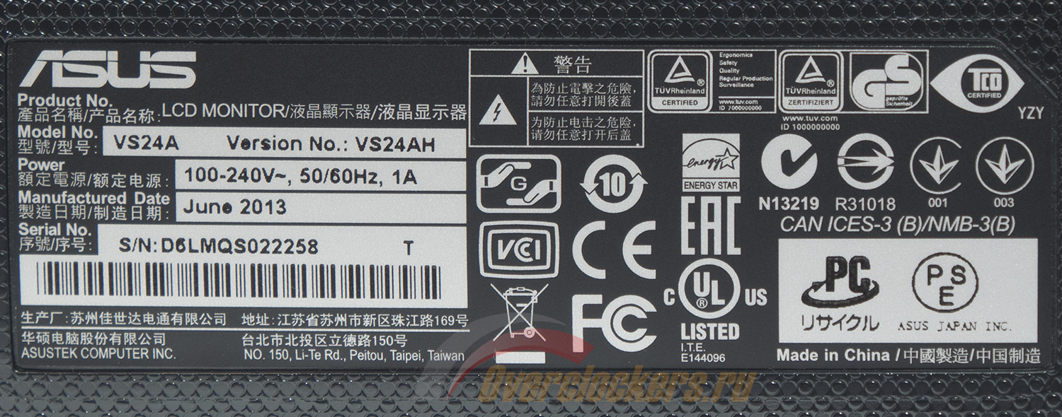 По наклейке на корпусе можно определить месяц/год (июнь 2013) и страну производства (Китай). Приведена информация о названии модели, номере продукта, серийном номере, а также данные о питании и соответствии различным стандартам. Каких-либо данных по ревизии VS24AH найдено не было.