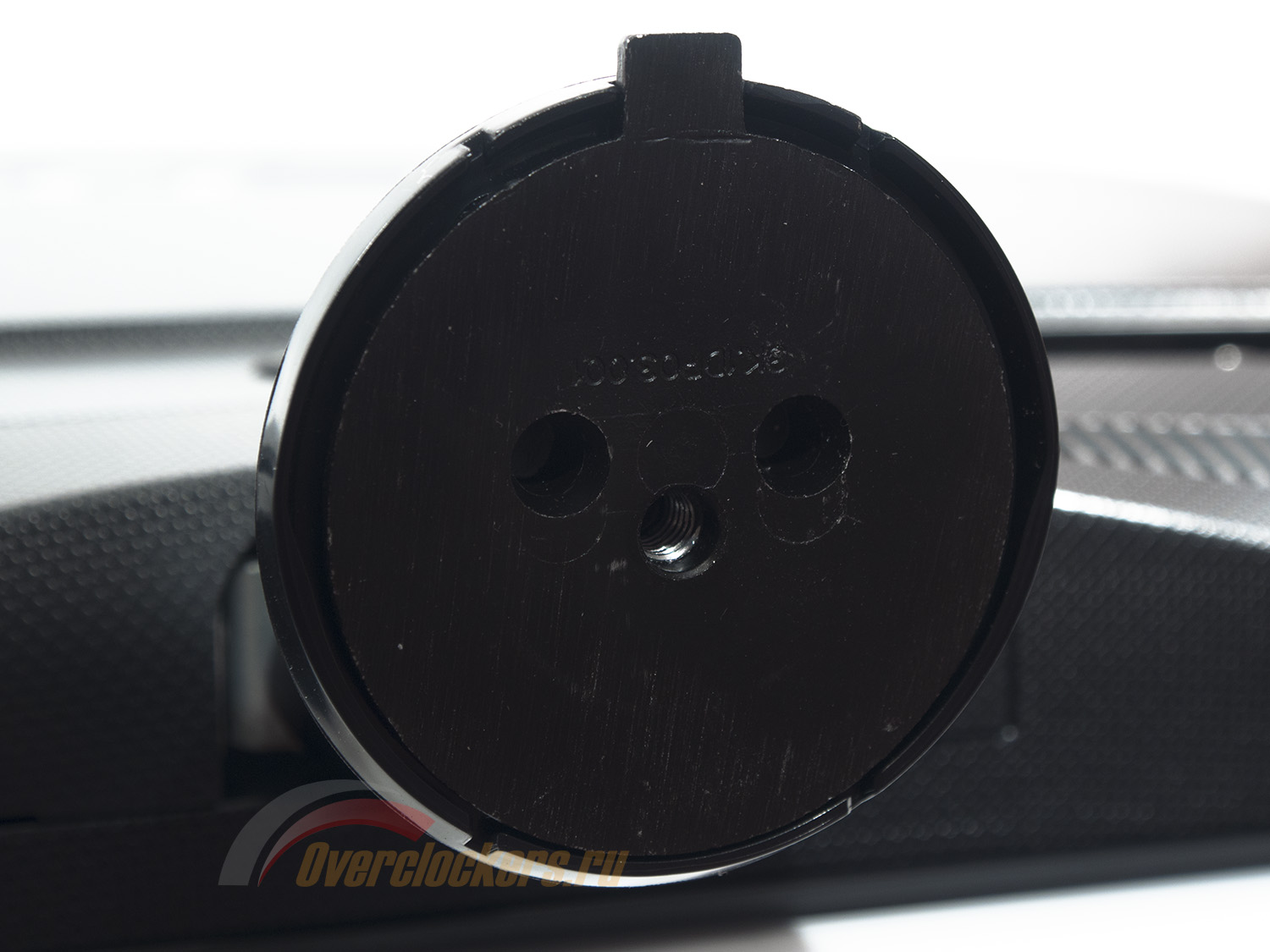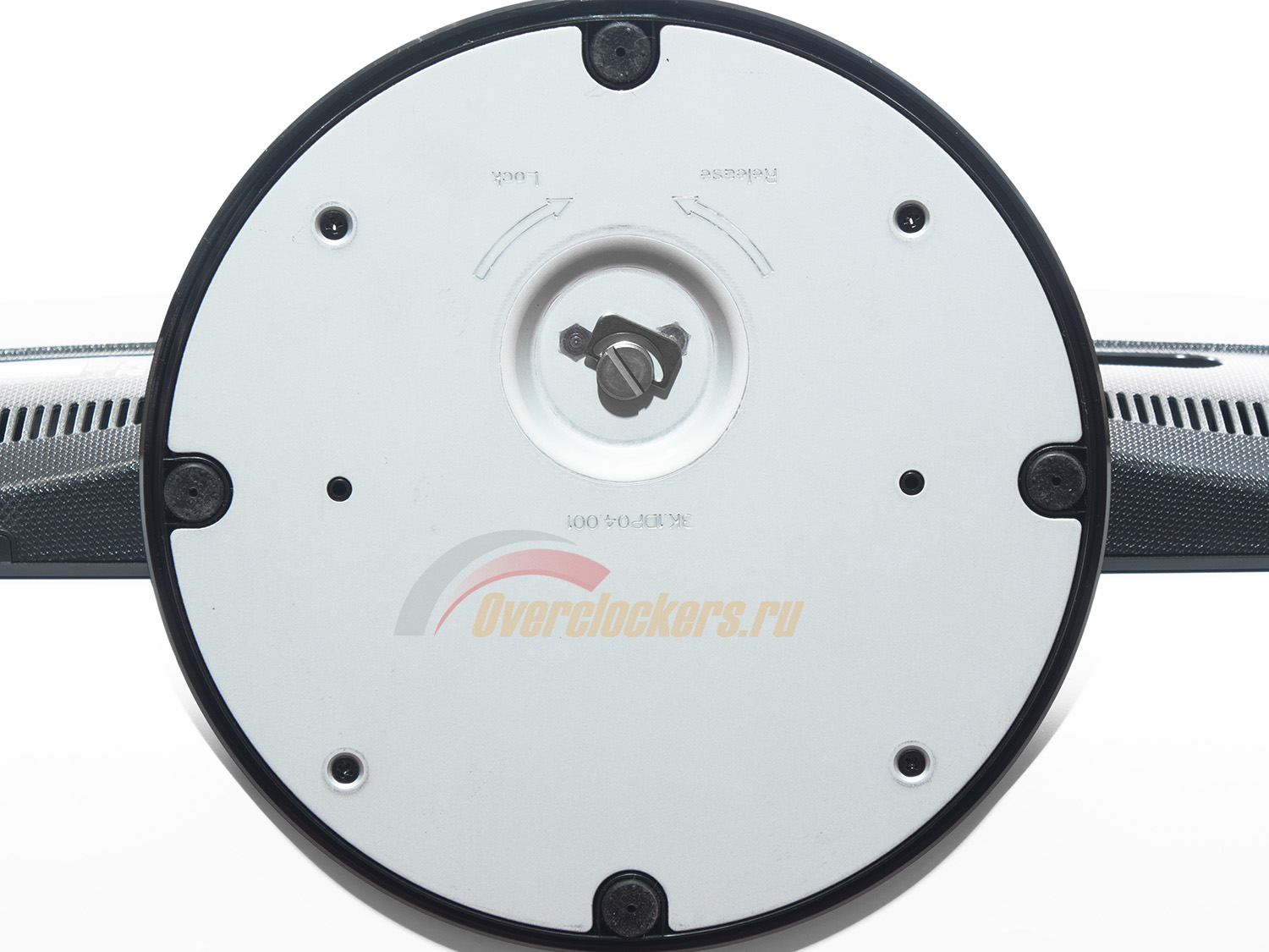 Круглая подставка небольшого размера из черного шершавого пластика, укрепленного металлом, гармонично дополняет рубленный и строгий дизайн устройства.