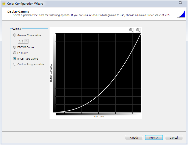 После этого программа дает возможность выбрать форму гамма-кривых. На выбор, помимо точных и известных многим значений, предоставляются варианты с включением кривых DICOM, L*Star и sRGB. Если не знаете, зачем все это надо – просто оставьте 2.2 (или sRGB для лучшей различимости теней).