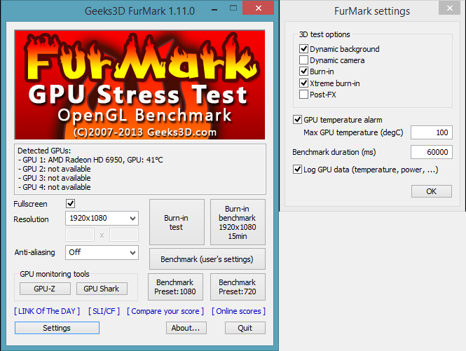 Фиксация показателей температур GPU и скорость вращения ее турбины производилась штатными средствами Furmark.