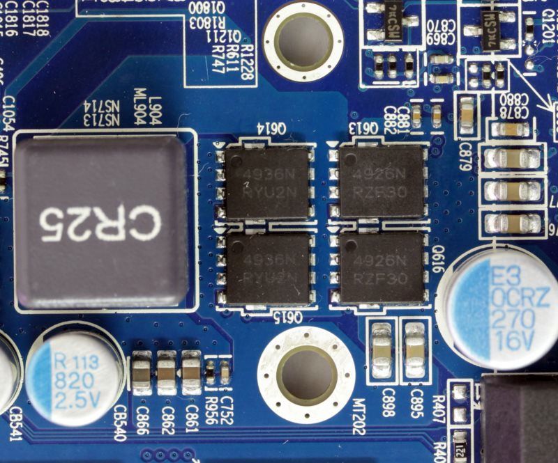 В каждой из шести фаз питания графического процессора применены транзисторные сборки типа DrMOS – Fairchild Semiconductor FDMF6823C.