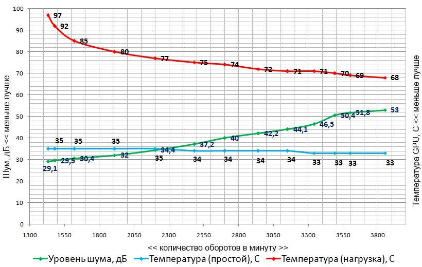 В заключение приведу график зависимости температуры и шума от скорости вращения крыльчаток вентиляторов.