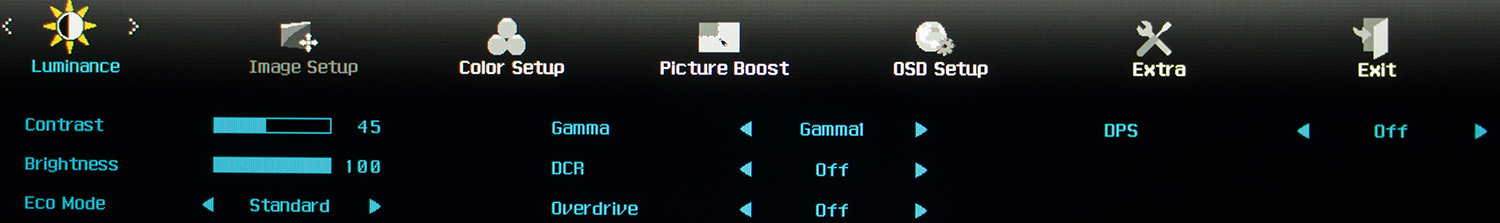 Итак, первый раздел – Luminance. В нем сосредоточены настройки яркости, контрастности, режимов гаммы и предустановленных пресетов изображения (Eco Mode), а также активатор динамической контрастности, режимы работы технологии разгона матрицы OverDrive и системы снижения энергопотребления DPS.