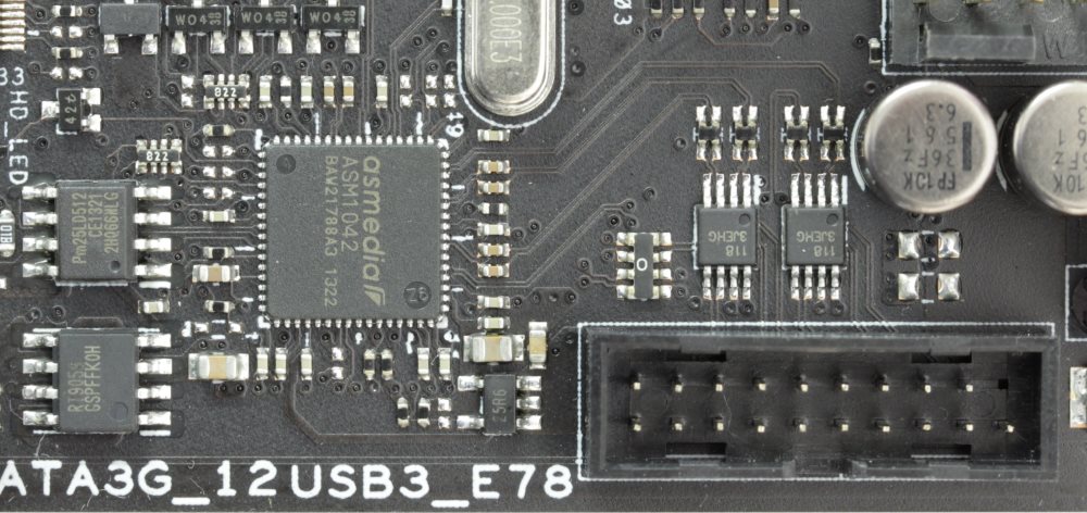 Еще одна такая микросхема находится в близости от задней панели. Она также обеспечивает два порта. Однако, поскольку на задней панели их шесть, то одного такого контроллера мало, поэтому рядом можно найти еще один - ASMedia ASM1074.