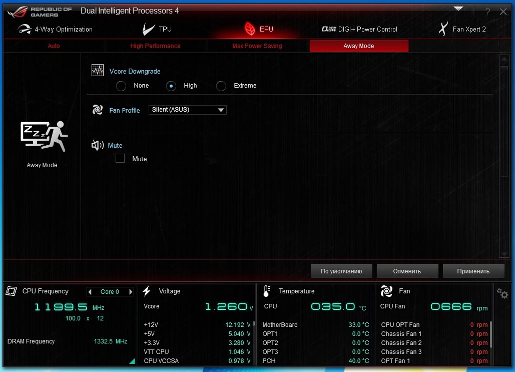 Как следует из названия, здесь осуществляется настройка всех вентиляторов, подключенных к материнской плате. В моем случае он был всего один. Помимо четырех профилей можно осуществлять настройки в ручном режиме.