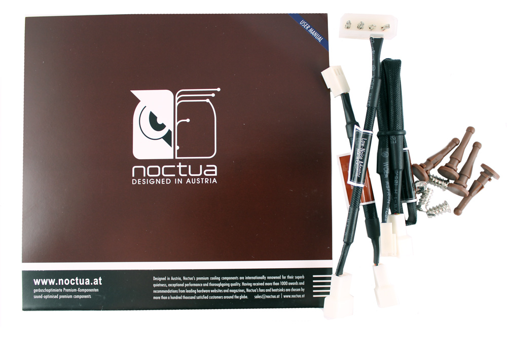 Вентилятор получил фиксированную скорость работы, а потому использует трехконтактный разъем подключения, при этом кабель обернут в оплетку (как и все комплектные адаптеры). Вообще, это уже традиция для Noctua, такая вот забота о мелочах за счет комплектации и качественной упаковки.