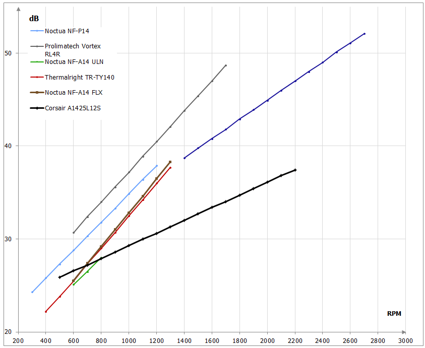 Звуковое давление, дБНа мой взгляд, совсем неплохие показатели, все же 140 мм модели при высоких оборотах действительно шумные, а тут все 1700 RPM. Конечно, в таком состоянии на все время его не оставишь, а вот при 600 оборотах Prolimatech опустился до вполне приемлемых 30 дБ.