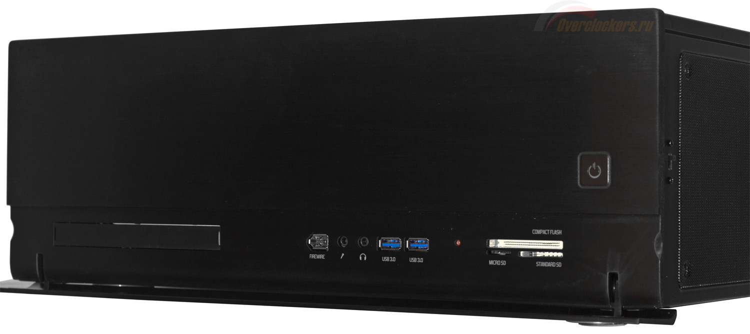 Доступ к остальным органам управления осуществляется откидыванием вниз нижней части панели. В наличии два порта USB 3.0 (подключение внутренним разъемом USB 3.0), мультиформатный кардридер (SD, MicroSD, Compact Flash), порт Firewire, а также пара аудиогнезд (с поддержкой стандарта HDA). Сигнализатором активности дисковой подсистемы служит светодиодный индикатор красного цвета.