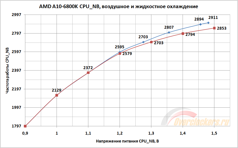 При переходе на жидкостное охлаждение процессор неплохо прибавил в разгоне, хотя итоговый результат это в полной мере и не отражает. Здесь ограничителем можно назвать материнскую плату, ибо как и в случае с процессором возникает ситуация, когда потенциал процессора еще вроде и не реализован, но следующий шаг частоты (в данном случае – 2955 МГц) для процессора недостижим независимо от установленного напряжения питания. Дабы лучше отразить разницу в разгоне CPU_NB при смене охлаждения, график для сравнения:
