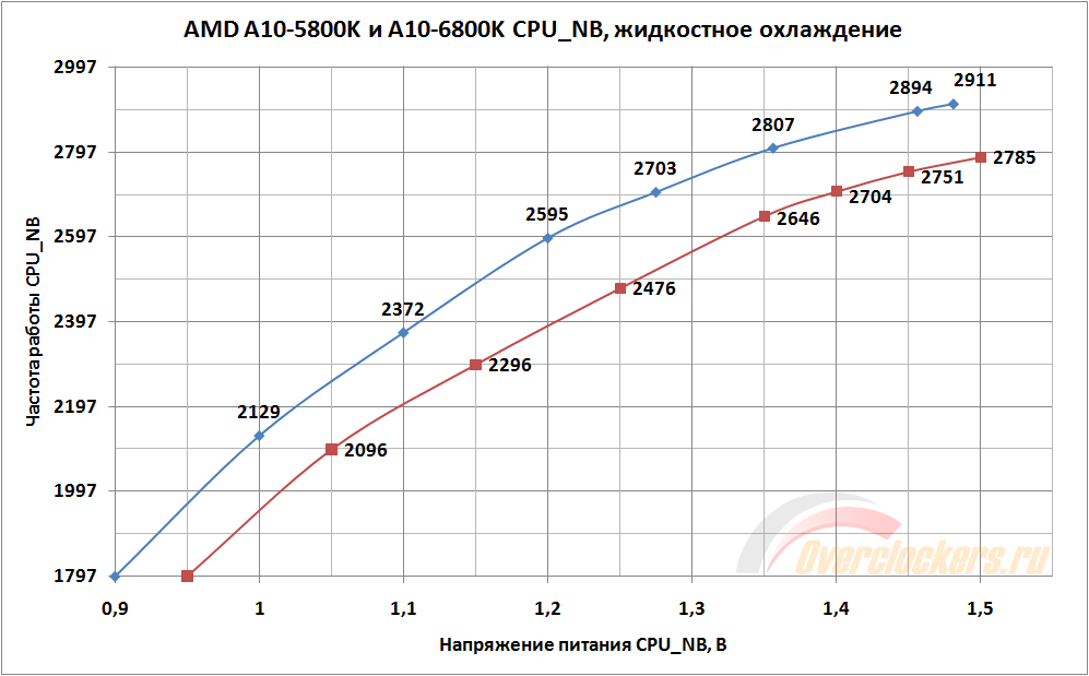 За точку отсчета взято минимальное напряжение питания, при котором система стабильна на штатной частоте CPU_NB в 1800 МГц (1797 МГц, с поправкой на точность установки базовой частоты материнской платой). Для A10-6800K такой отметкой стало значение 0.9 В.