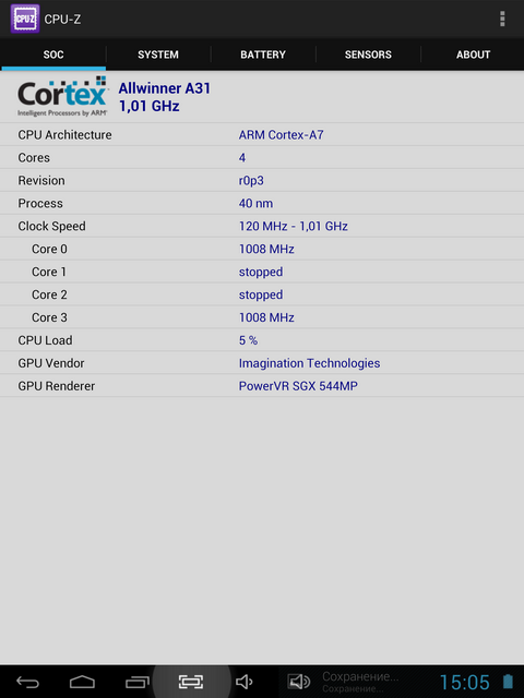 Теперь - посмотрим, что скажет о «начинке» планшета утилита CPU-Z (простенькая, но весьма информативная).