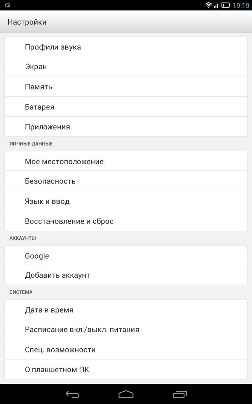 Меню настроек и сведения о планшете.