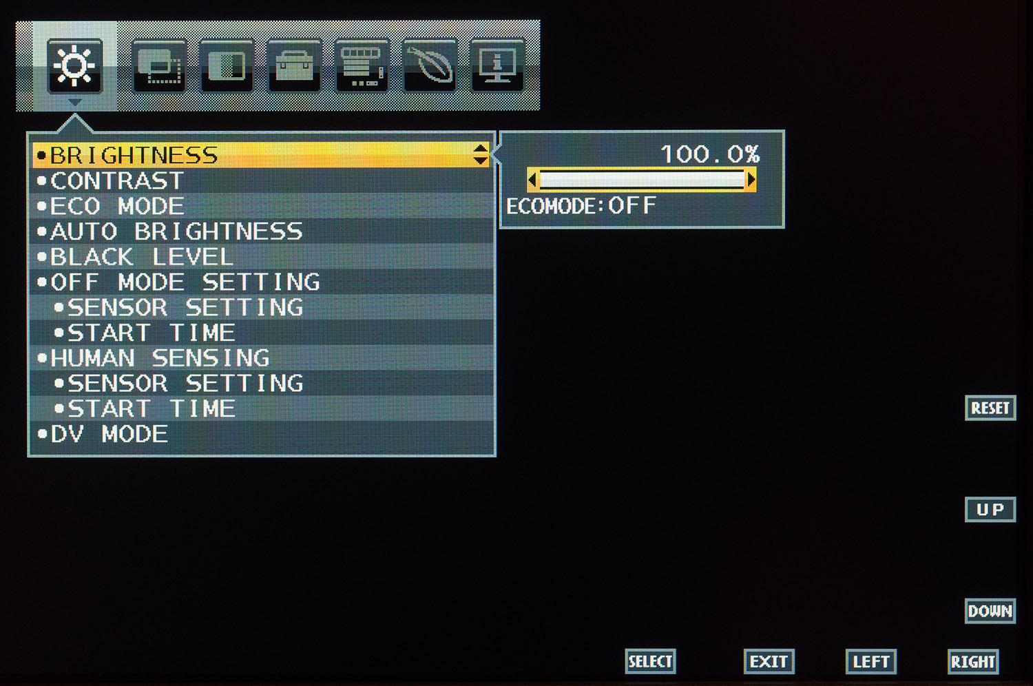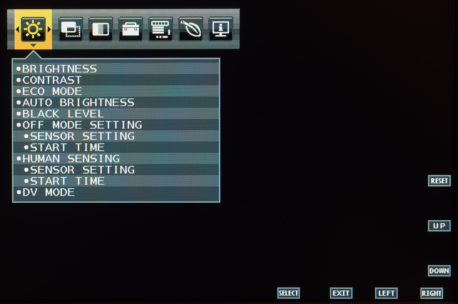 Первый раздел предлагает доступ к настройкам яркости, контраста, уровню черного, встроенным пресетам DV Mode. Здесь же находятся параметры ответственные за работу датчиков внешней освещенности и присутствия, к которым у меня нет претензий.