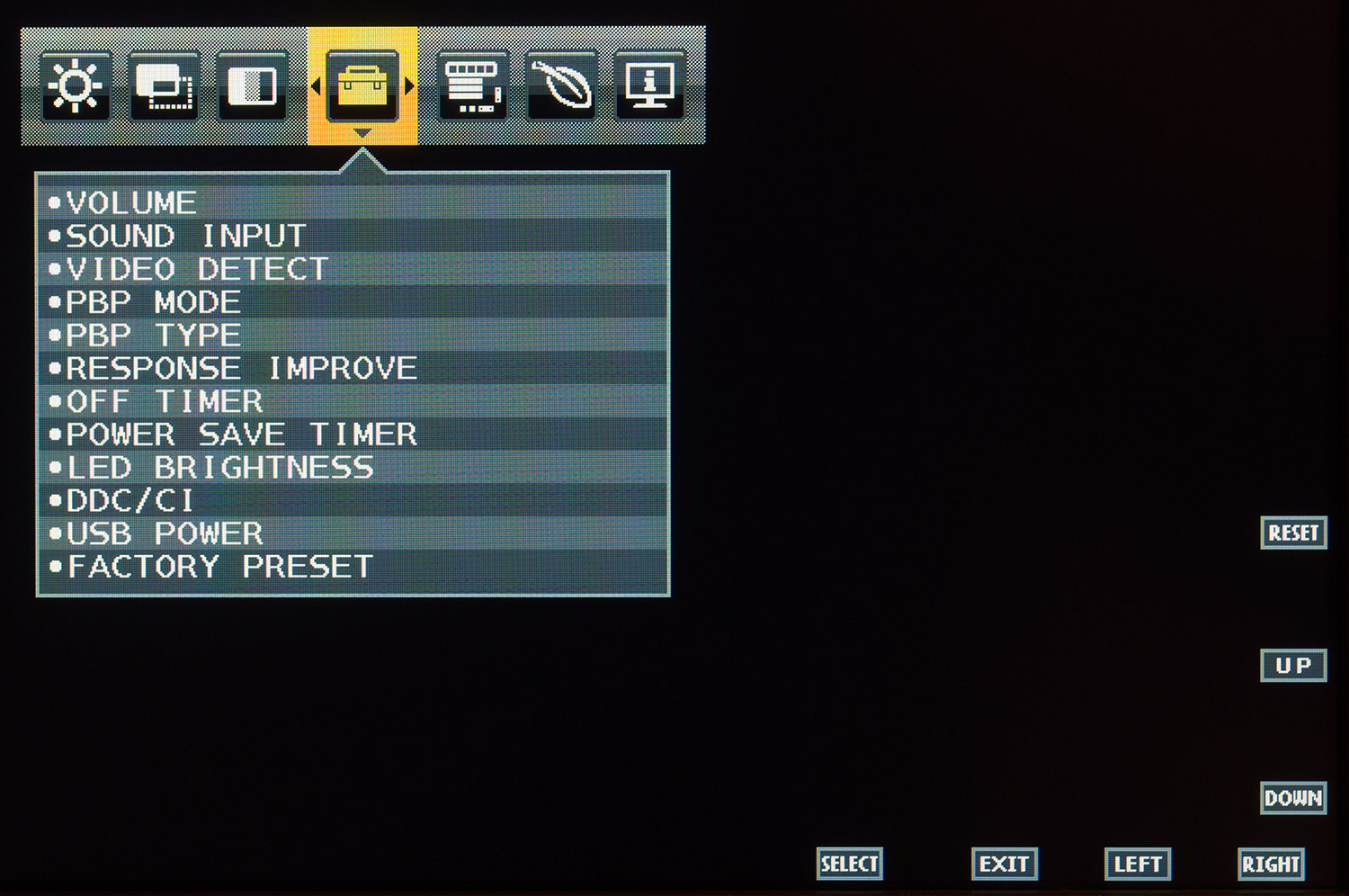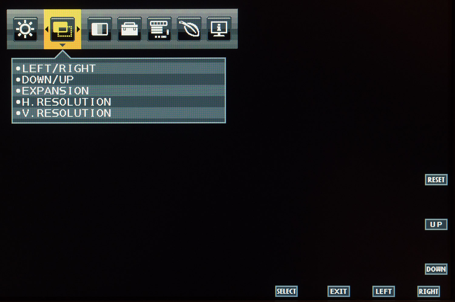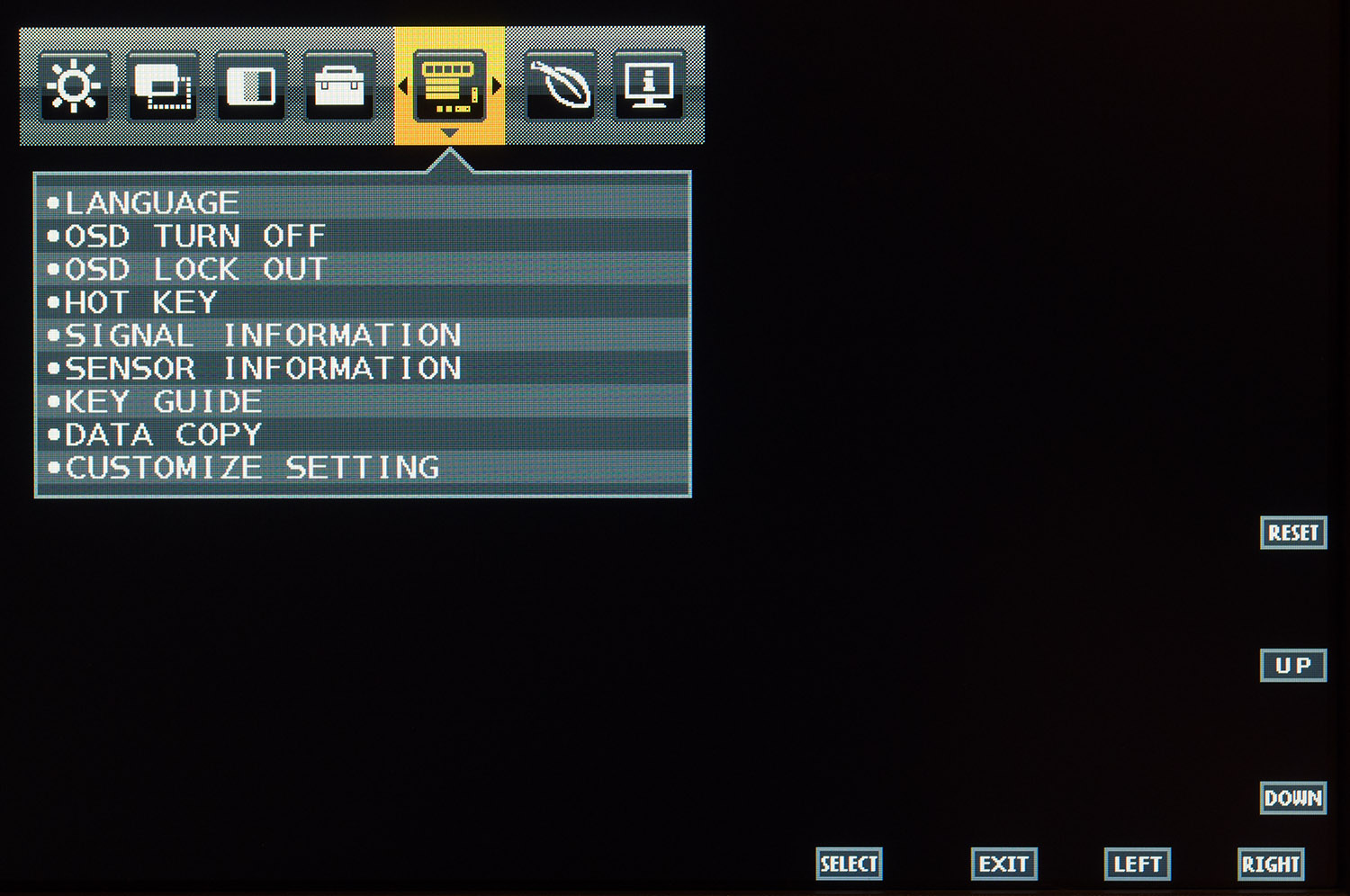 Управление монитором производится посредством восьми сенсорных клавиш, одной из которых является кнопка включения с расположенным рядом светодиодом питания. Нанесенные пиктограммы являются указателями на функцию каждой из них.